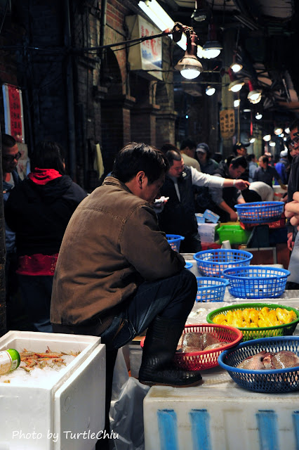 大約午夜一點多,載著漁貨的大卡車就陸續進駐卸貨,窄窄的路兩旁都是店家,中間擠了大卡車,再加上批發商的推車和籃子,人聲鼎沸,若不懂得閃既容易受傷也妨礙別人做生意。